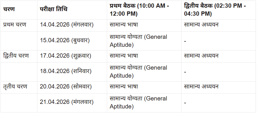 परीक्षा का प्रथम चरण 14 और 15 अप्रैल 2026 को आयोजित होगा। 14 अप्रैल को पहली बैठक में सामान्य भाषा और दूसरी बैठक में सामान्य अध्ययन का पेपर होगा। 15 अप्रैल को सामान्य योग्यता (General Aptitude) की परीक्षा आयोजित की जाएगी।