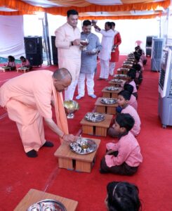 शिवपुर के कंपोजिट विद्यालय में ‘स्कूल चलो’ अभियान के शुभारंभ अवसर पर मुख्यमंत्री योगी आदित्यनाथ ने शिक्षारत बच्चों को मिड-डे मील परोसा। उन्होंने अत्यंत श्रद्धा भाव से बच्चों को भोजन कराया तो बच्चों ने भी खिलखिलाकर सीएम के प्रति आभार प्रकट किया। जब मुख्यमंत्री ने बच्चों से कहा कि रोज स्कूल आना और मेहनत से पढ़ना, तो बच्चों ने भी सिर हिलाकर हामी भरी। बच्चों ने मासूमियत से हाथ जोड़कर सीएम को अपना प्रणाम भी निवेदित किया। बच्चों को भोजन परोसने में सीएम के साथ उनके मंत्री व जनप्रतिनिधि भी शामिल रहे।